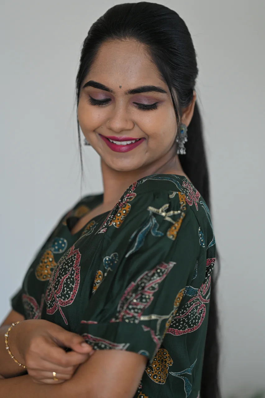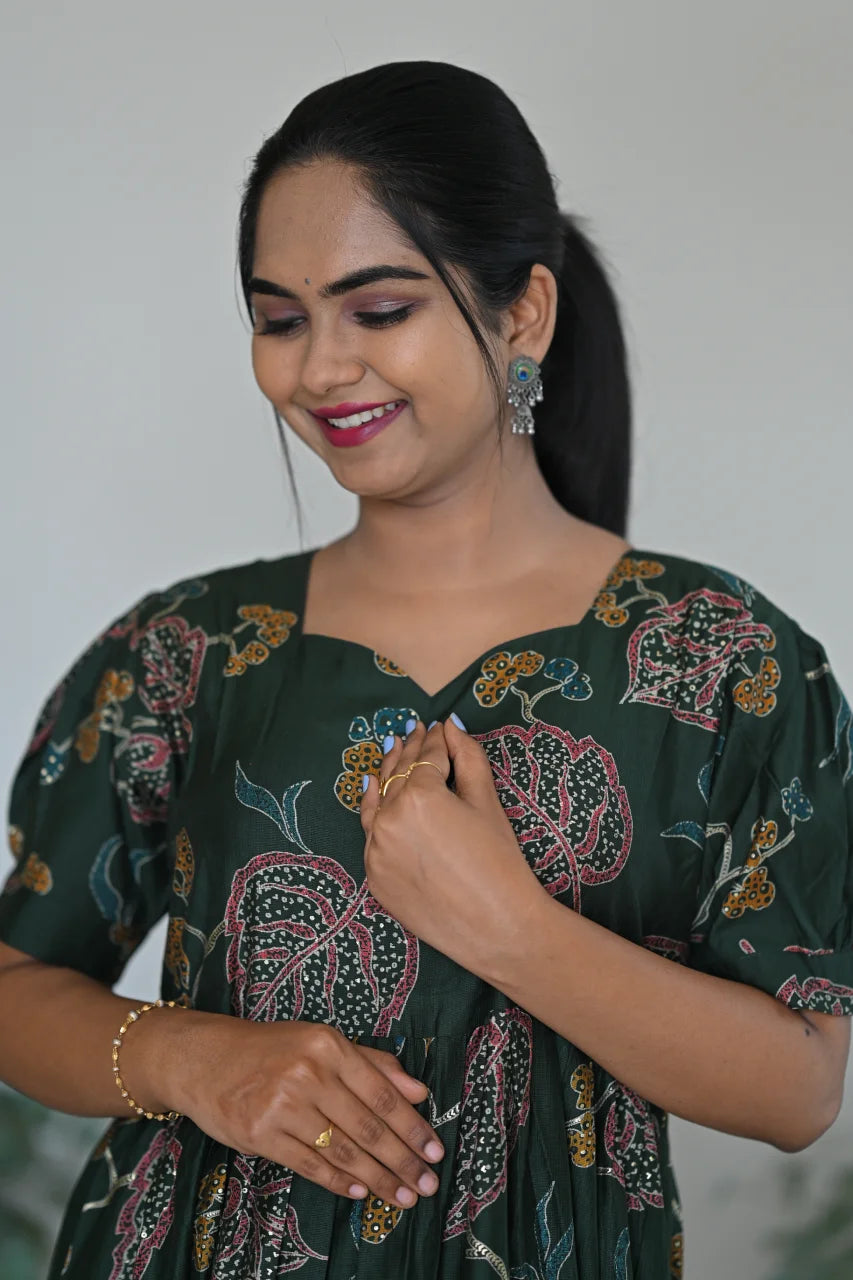 Elevate your boho style in this Bottle Green Batik Print Tiered Midi Dress. Featuring a sweetheart neck and chic puff sleeves for a trendy, feminine fit.