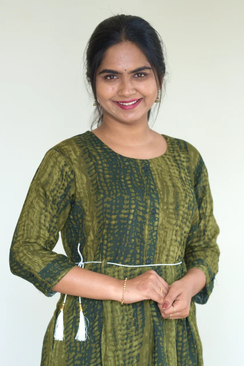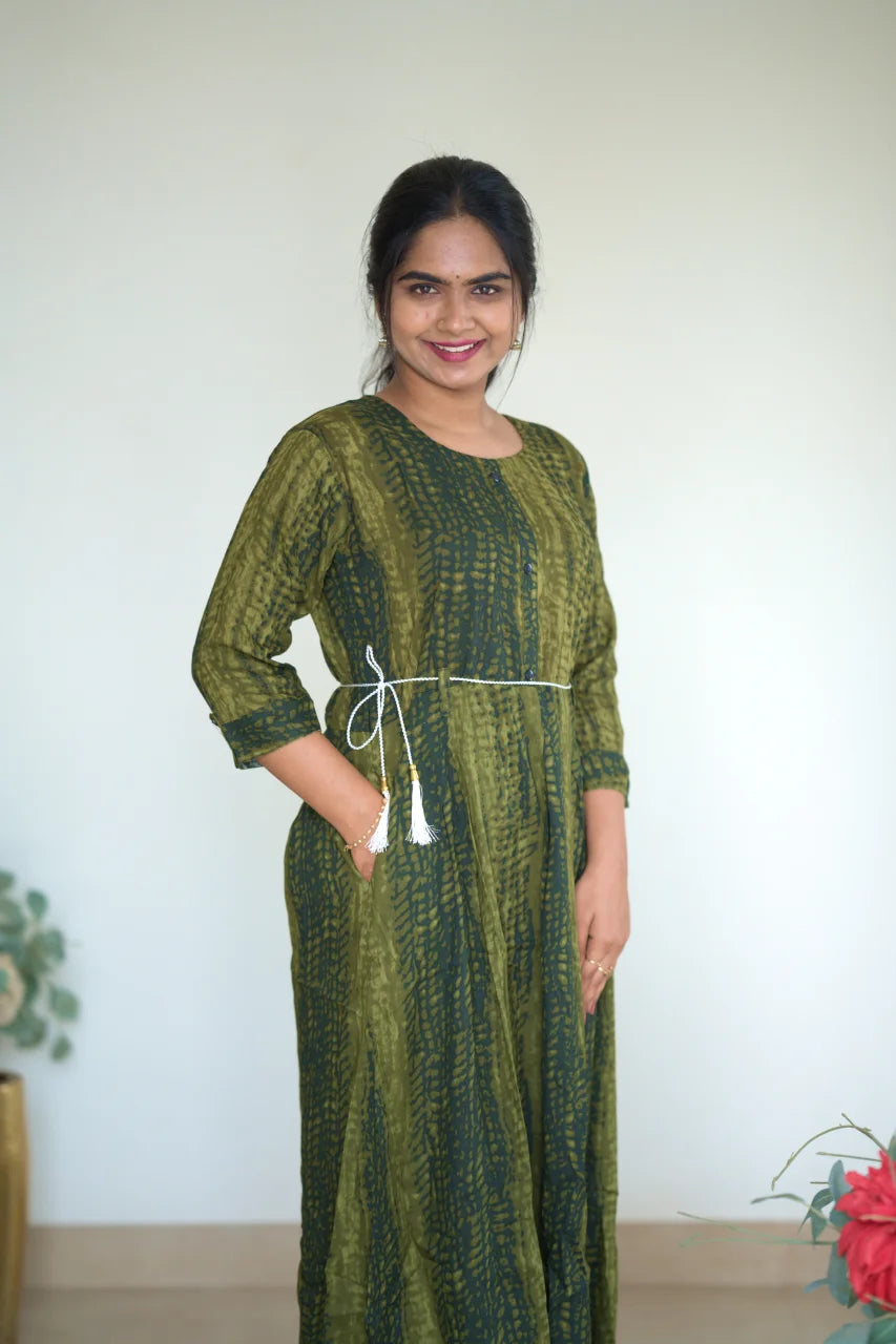 Elevate your everyday ethnic wardrobe with this elegant olive green A-line kurti, crafted from breathable cotton fabric for all-day comfort. Featuring a subtle all-over print and a relaxed silhouette, this kurti is thoughtfully designed with a detachable waist belt to enhance the fit and styling versatility. Perfect for workwear, casual outings, and relaxed festive moments, it blends comfort with understated elegance.