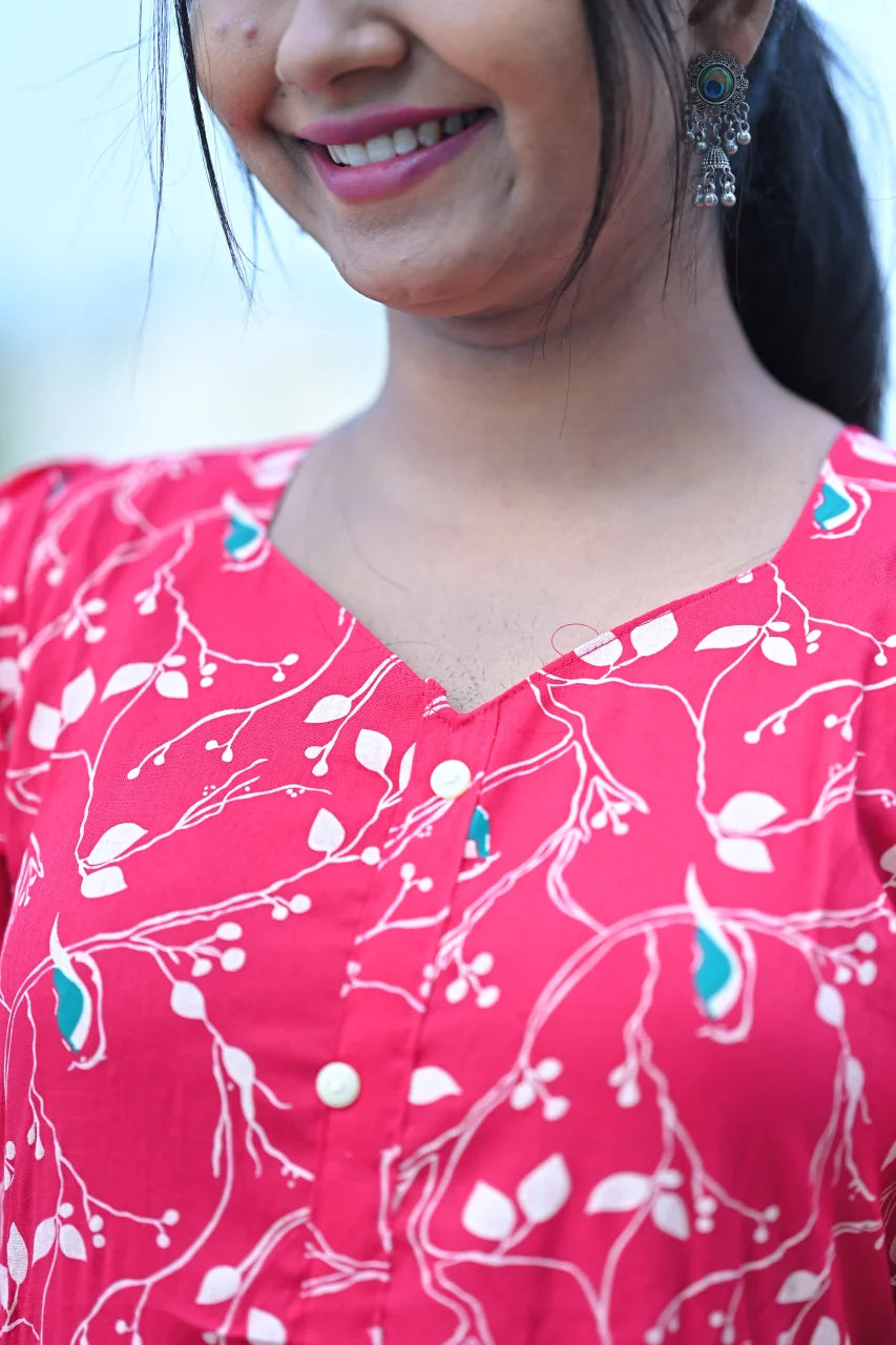 Bright, cheerful, and effortlessly stylish, this ruby red printed cotton A-line Kurti is designed to bring comfort and charm together. Crafted from breathable cotton fabric, it feels soft against the skin and keeps you comfortable throughout the day.