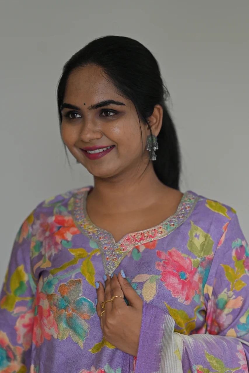 Lavender Floral Printed Cotton Straight Kurta Set with Mirror Work & Dupatta