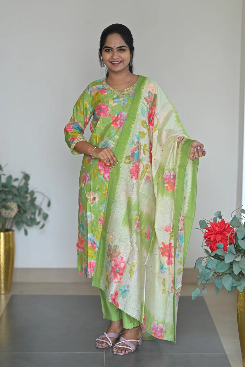 Elevate your ethnic style with this Light Green Floral Cotton Kurta Set. Features a straight-cut kurta, matching pants, and a printed dupatta.