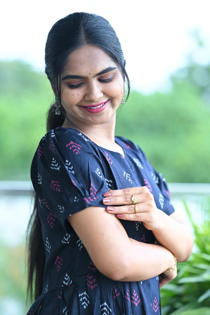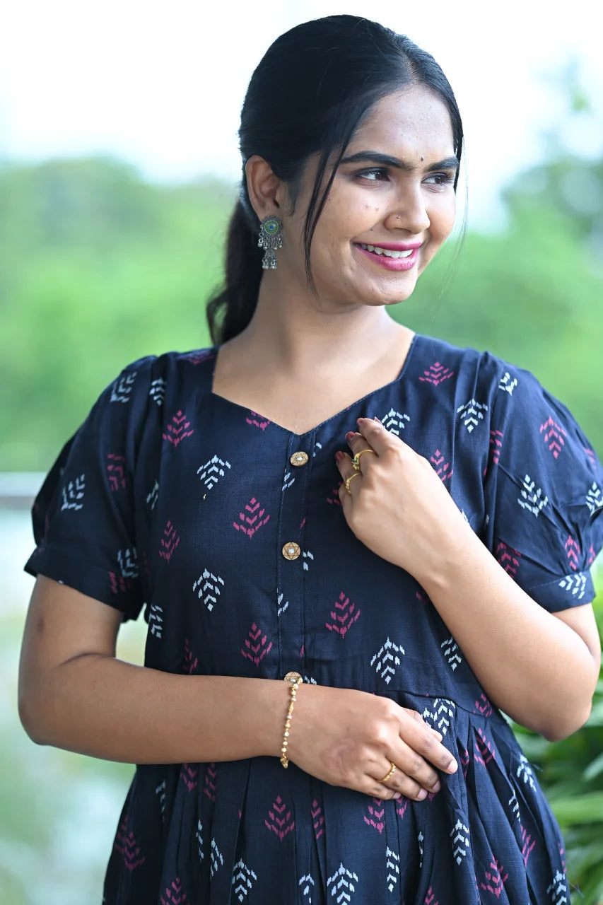 Step into effortless elegance with this midnight indigo printed cotton A-line Dress, designed for women who love comfort with a touch of traditional charm. Made from soft, breathable cotton, this dress feels light on the skin and is perfect for warm days and long hours of wear.