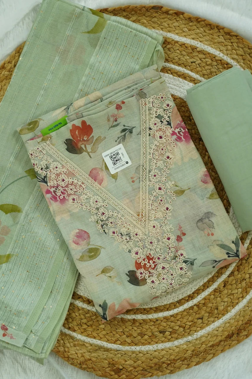 Embrace subtle elegance with the Mint Garden Unstitched Kurti Set, designed in soothing pastel green tones with delicate floral prints. The kurti fabric is beautifully enhanced with intricate embroidery along the neckline, adding a refined handcrafted touch to the design.