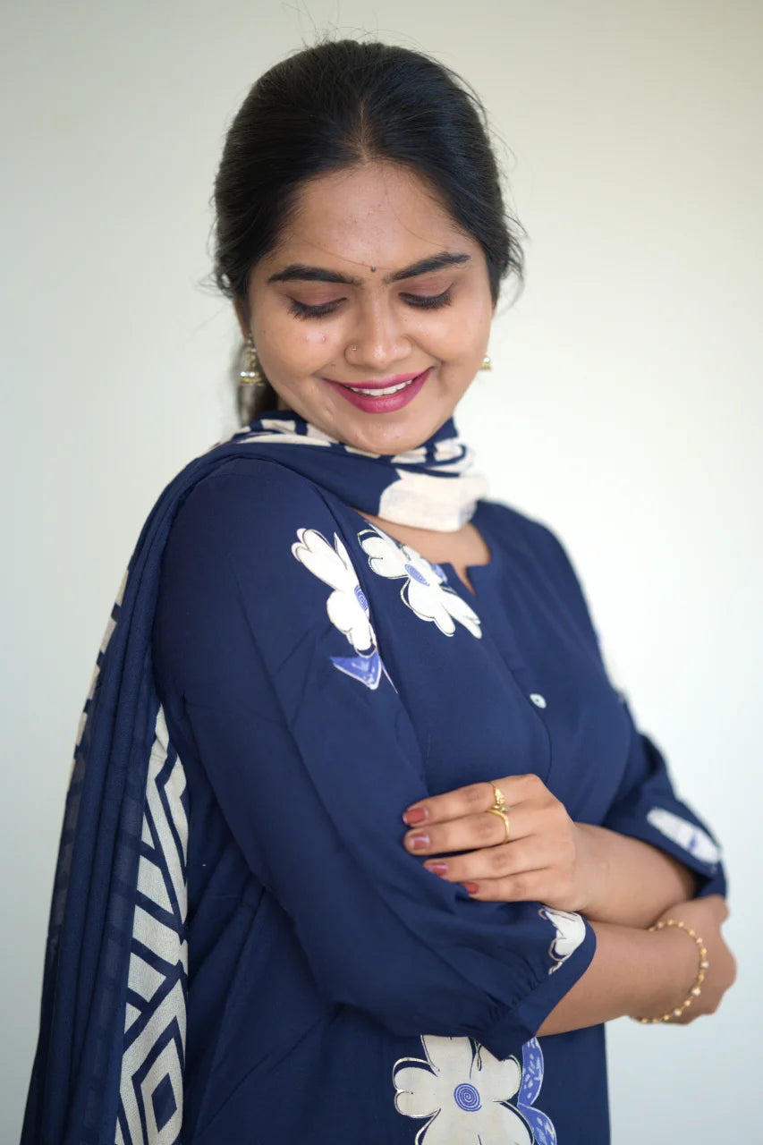 Navy Blue Floral Print Kurti Set with Contrast Detailing