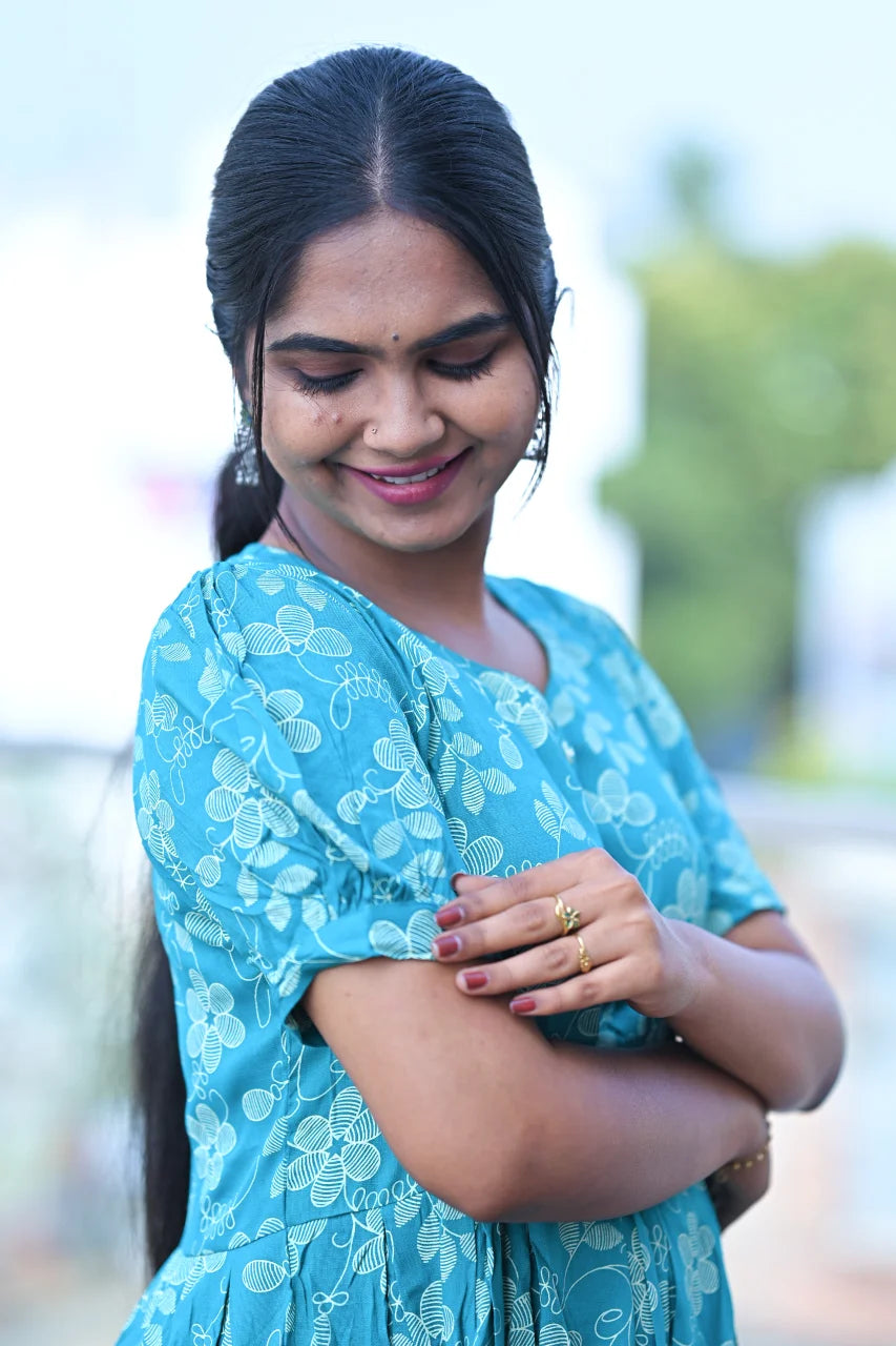 The soothing sea green base is beautifully highlighted with delicate all-over floral prints, giving it a fresh and feminine appeal. A classic V-neckline with neat front detailing enhances the neckline, while the gently gathered waist creates a flattering silhouette that suits all body types. The short puff sleeves add a subtle modern touch, making this kurti perfect for daily wear, office use, or casual outings.
